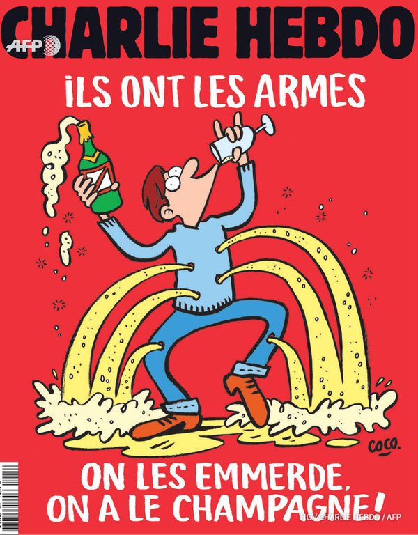 The upcoming Charlie Hedbo satirical magazine is expected to hit newsstands Wednesday. The cover reads: "They have the weapons. Screw them. We have the champagne!" The magazine's office was the target of a terror attack in July. I don't possess that wonderful French insouciance that I so admire, so I quote Shakespeare: