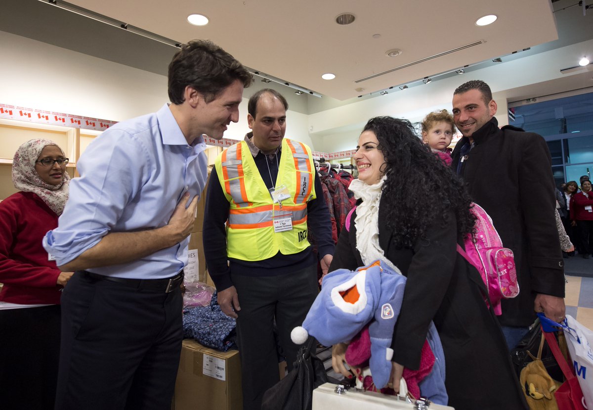 Trudeau greeted some of the families to come through processing. The first family was Kevork Jamkossian, a gynecologist from Aleppo, his wife Georgina Zires, a lab technician, and their 16-month-old daughter Madeleine.